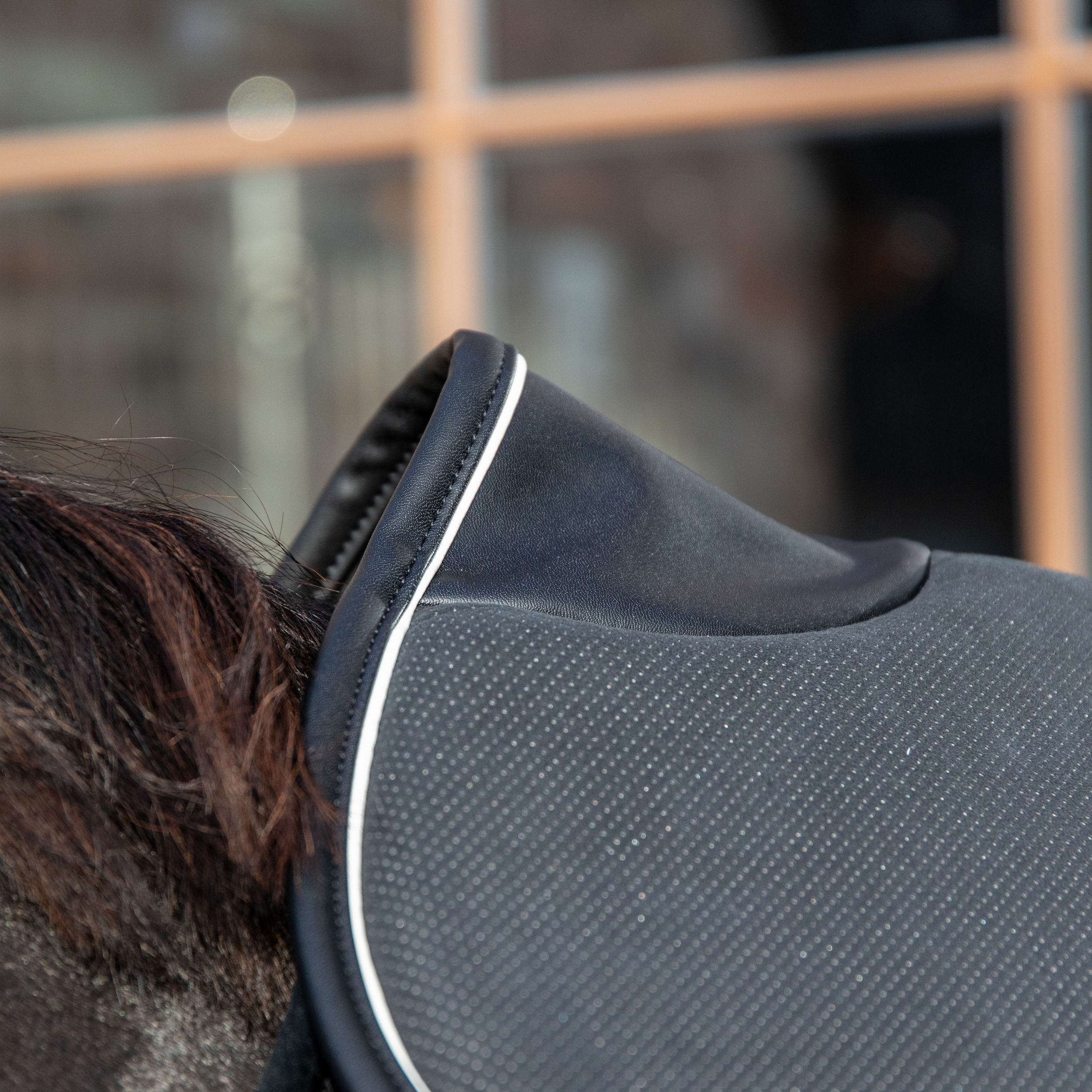 De dun gelaagde vorm biedt maximale vrijheid, comfort en stabiliteit en vermindert mogelijke rugpijn. De schoft is vrij van druk dankzij het artificieel leder inzetstuk.