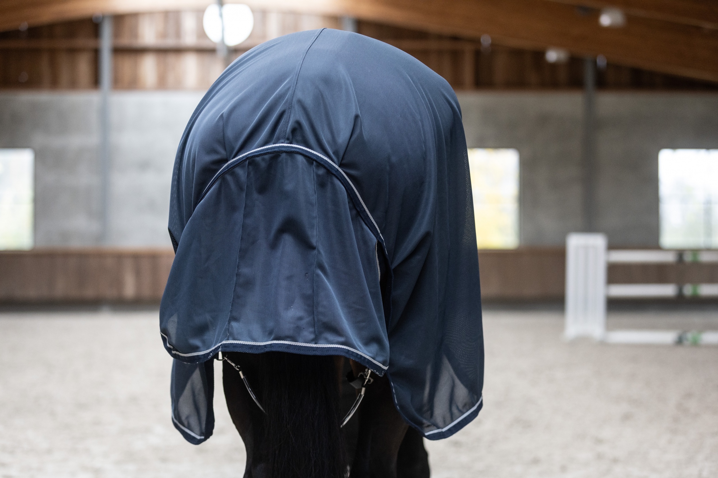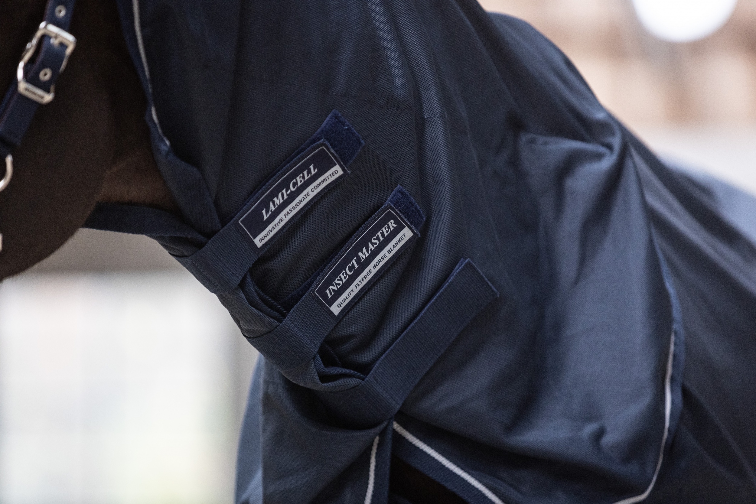 Opties Het vliegendeken Insect Master biedt volledige dekking om het paard te beschermen tegen vervelende insecten met zijn duurzame en ademende interlock mesh-stof. Het deken biedt 80 % UV bescherming en heeft een afneembaar buikgedeelte en nekstuk voor aanpasbare bescherming, samen met een staartflap en een afneembaar staarttouw om het deken op zijn plaats te houden. Alle sluitingen zijn beveiligd met klittenband voor een comfortabele, verstelbare en probleemloze pasvorm. De innovatieve vorm en het ontwerp zorgen voor zowel superieure bewegingsvrijheid als de ultieme comfortabele pasvorm voor je paard. Je kan de look compleet maken met het bijpassende Insect Master vliegenmasker voor uitgebreide vliegenbescherming