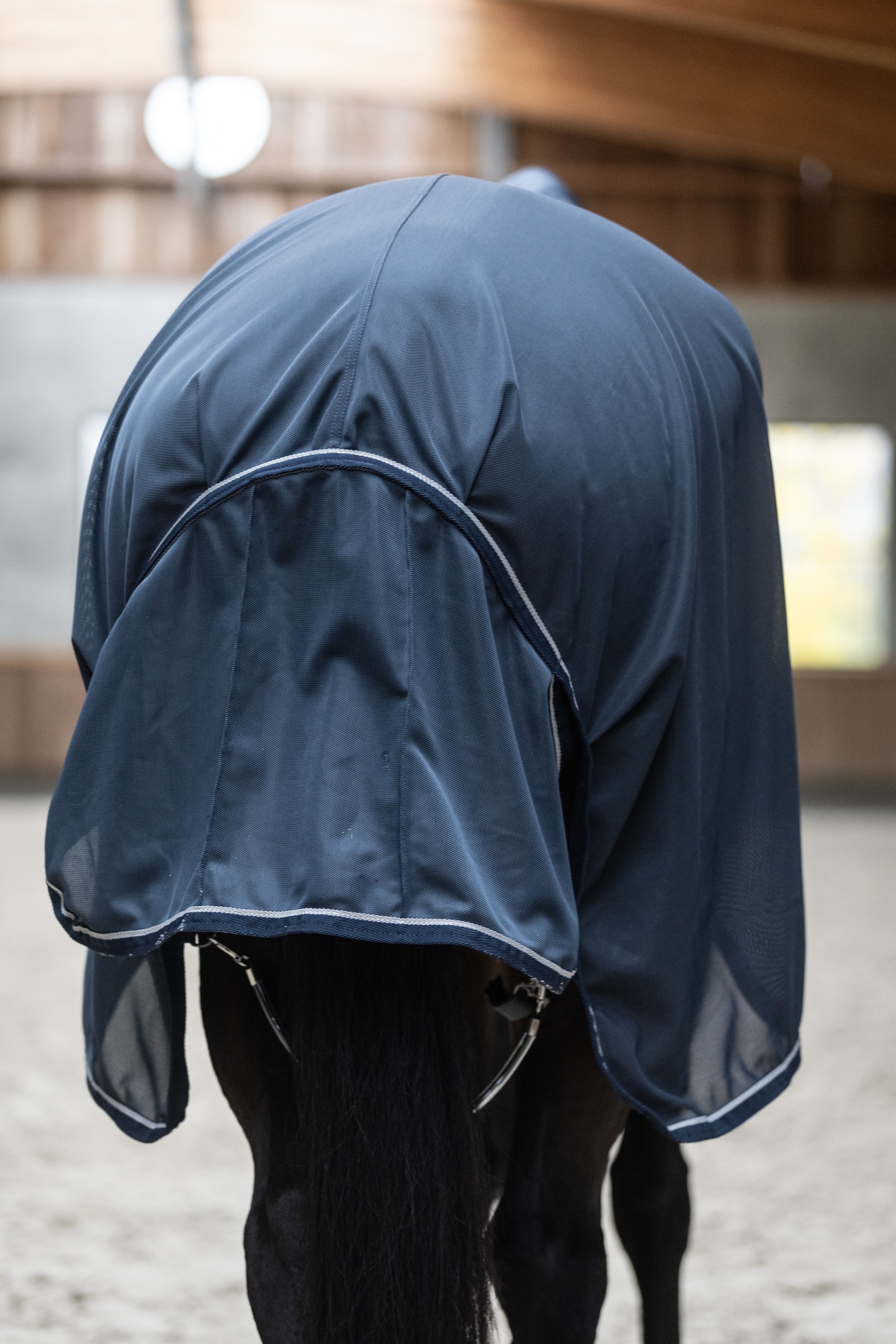 Het vliegendeken Insect Master biedt volledige dekking om het paard te beschermen tegen vervelende insecten met zijn duurzame en ademende interlock mesh-stof. Het deken biedt 80 % UV bescherming en heeft een afneembaar buikgedeelte en nekstuk voor aanpasbare bescherming, samen met een staartflap en een afneembaar staarttouw om het deken op zijn plaats te houden. Alle sluitingen zijn beveiligd met klittenband voor een comfortabele, verstelbare en probleemloze pasvorm. De innovatieve vorm en het ontwerp zorgen voor zowel superieure bewegingsvrijheid als de ultieme comfortabele pasvorm voor je paard. Je kan de look compleet maken met het bijpassende Insect Master vliegenmasker voor uitgebreide vliegenbescherming