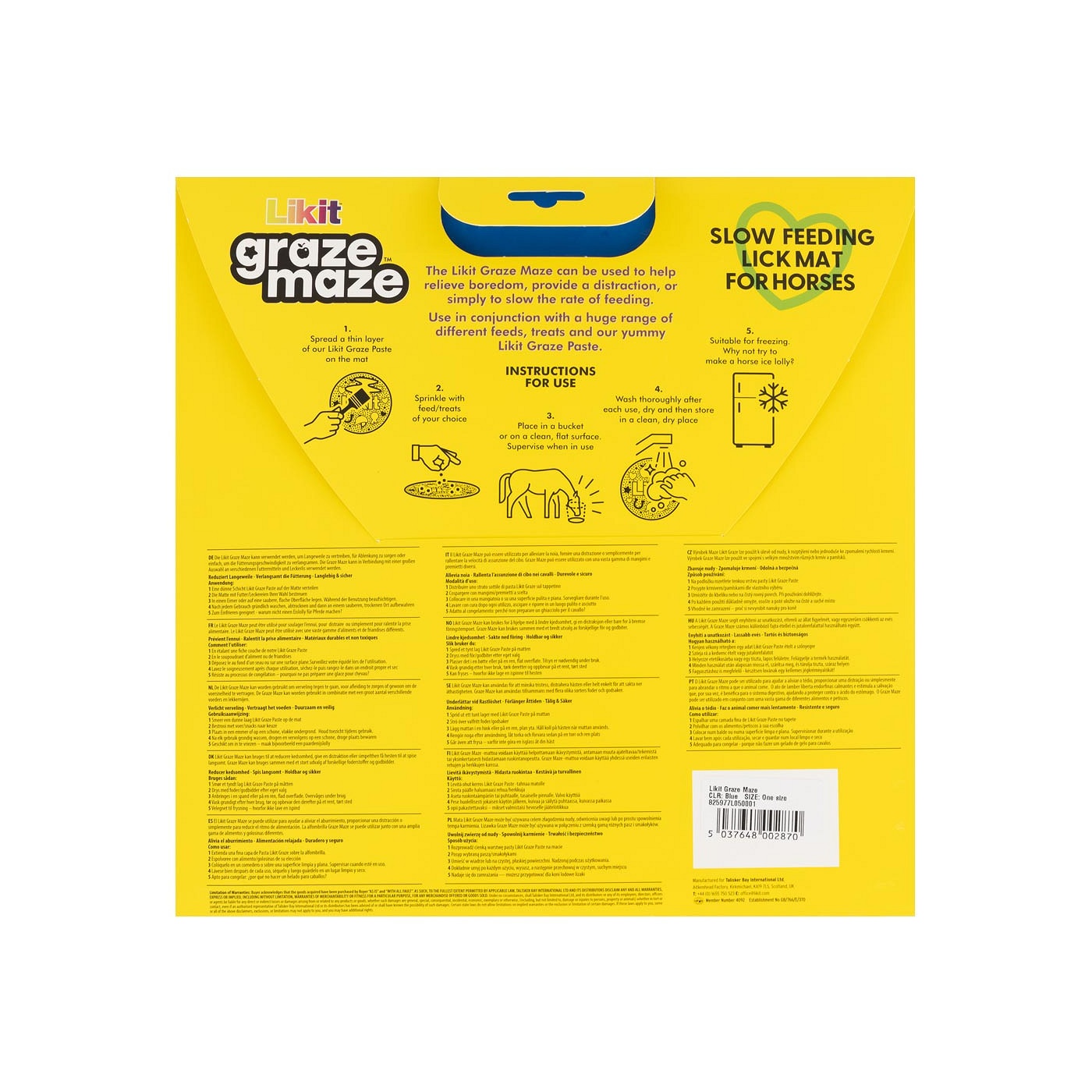 De Graze Maze likmat is een kleurrijke mat met leuke figuurtjes en patroontjes. Bedek de mat met de speciaal ontwikkelde Graze Paste-likpasta (artikel 825978) in combinatie met lekkernijen zodat je paard meer wordt uitgedaagd en afgeleid dan normaal tijdens het eten. Gebruik de mat als bodem in een voer-emmer of leg de mat op een ander schoon oppervlak.
