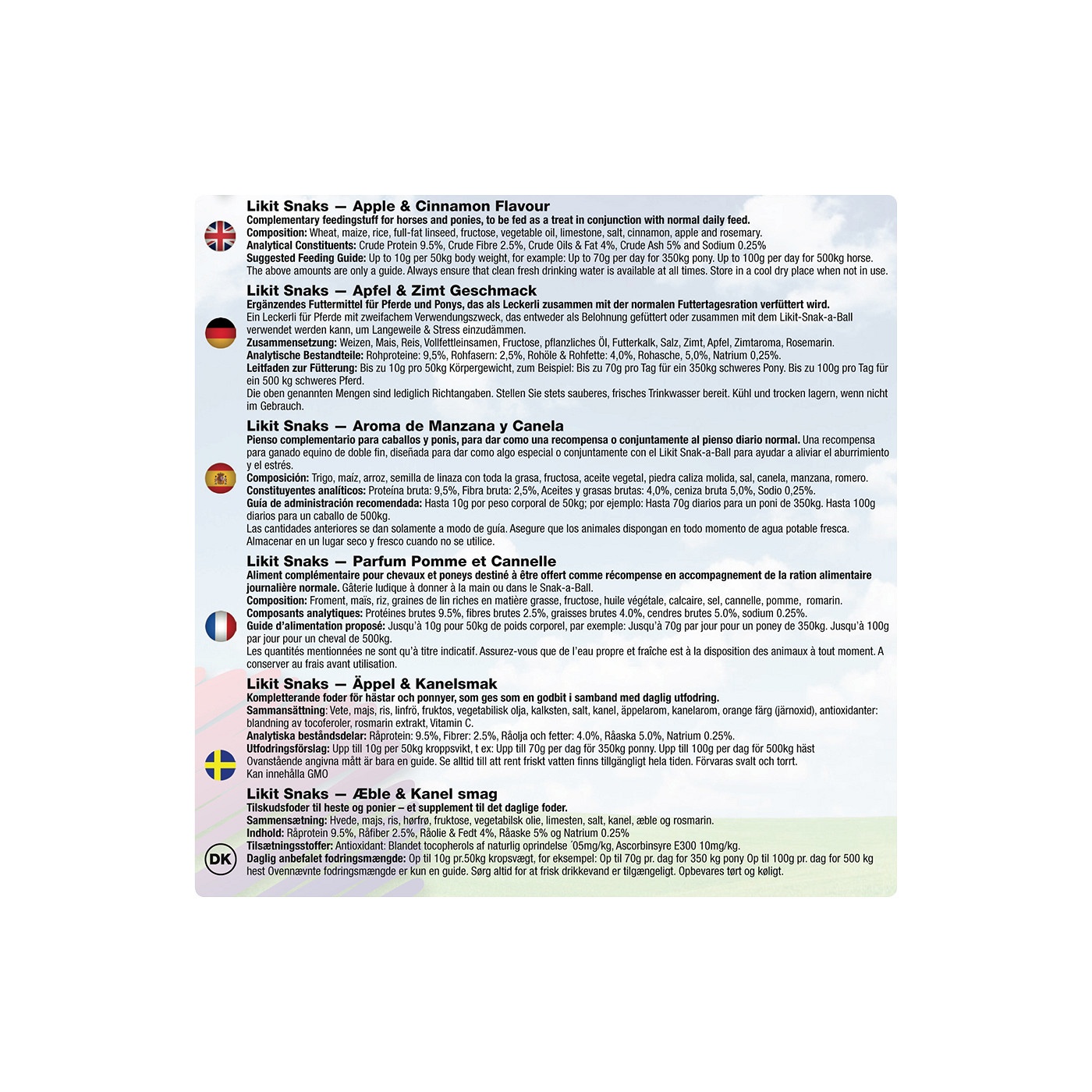 De nieuwe Likit Snaks zijn smakelijke, krakende, hartvormige snoepjes die passen in de Likit voederrolbal Snak-a-Ball, artikel 829946, tegen stalverveling of die uit de hand gevoerd kunnen worden als beloning. De Snaks hebben een appel/kaneel smaak. De Snaks bevatten geen toegevoegde kleur- of geurstoffen en bevatten weinig suiker. Zakje van 500 g. VE 10.