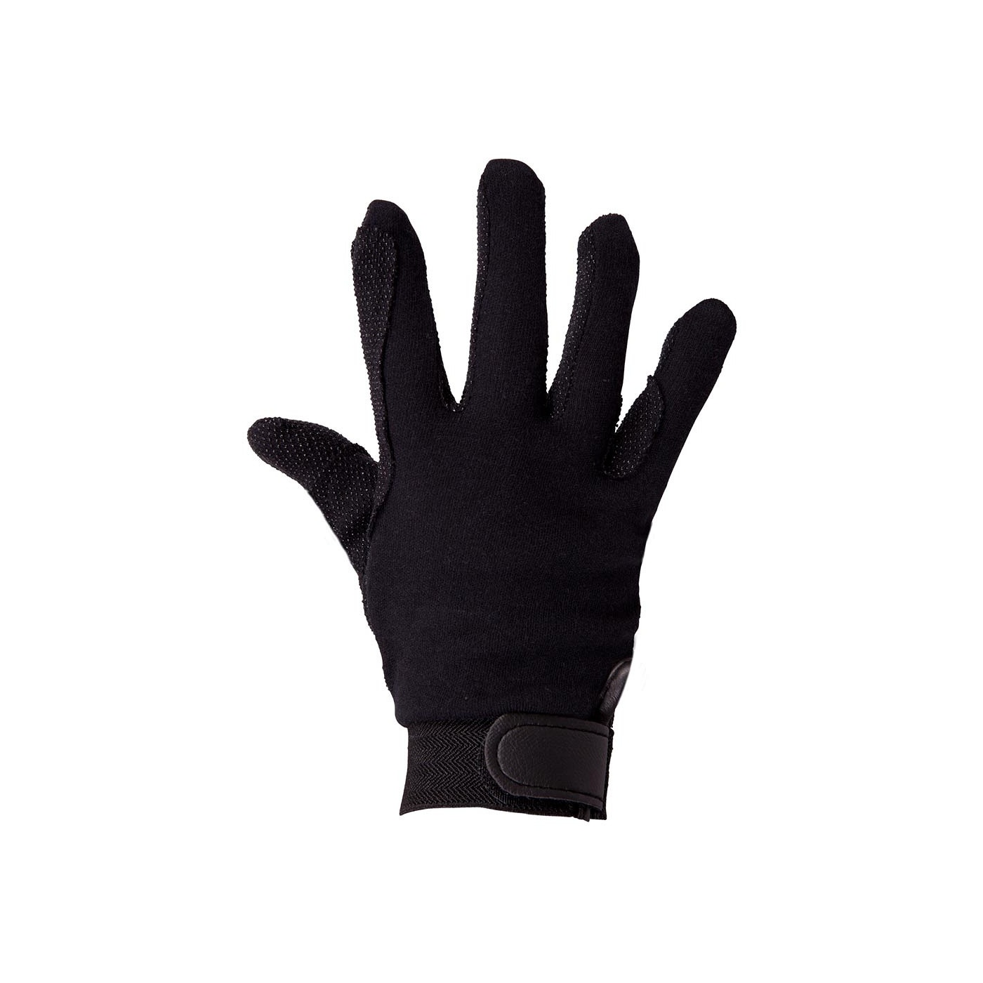 Chique katoenen rijhandschoen met antislip binnenkant, teugelversterking en klittenbandsluiting.