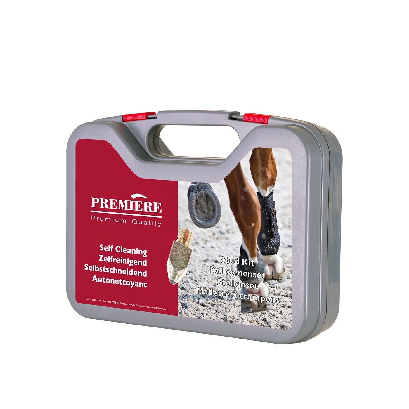 Complete zelfreinigende kalkoenenset in praktische opbergkoffer, bestaande uit 2 x 8 stalen kalkoenen (twee soorten), 8 pluggen, 10 rubberen dopjes, tap en sleutel in één, inbussleutel en krabber met stalen borsteltje voor het schoonmaken van de kalkoengaten. Type schroefdraad: M12.