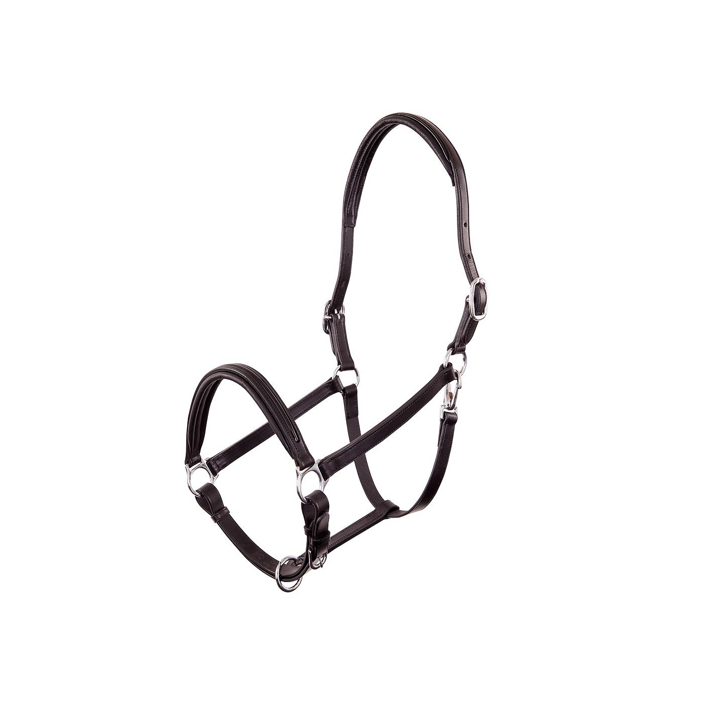 Dit stijlvolle halster is vervaardigd van mooi afgewerkt leder. Het kopstuk is zacht gevoerd en aan beide zijden verstelbaar met een gespsluiting. De keelriem is voorzien van een quick release clip. De neusriem is zacht gevoerd en verstelbaar met een gespsluiting. Zowel het kopstuk als de neusriem is verfraaid met lakleder voor een chique uitstraling. Het halster is uitgerust met glanzende, zilverkleurige fournituren van verchroomd messing.
