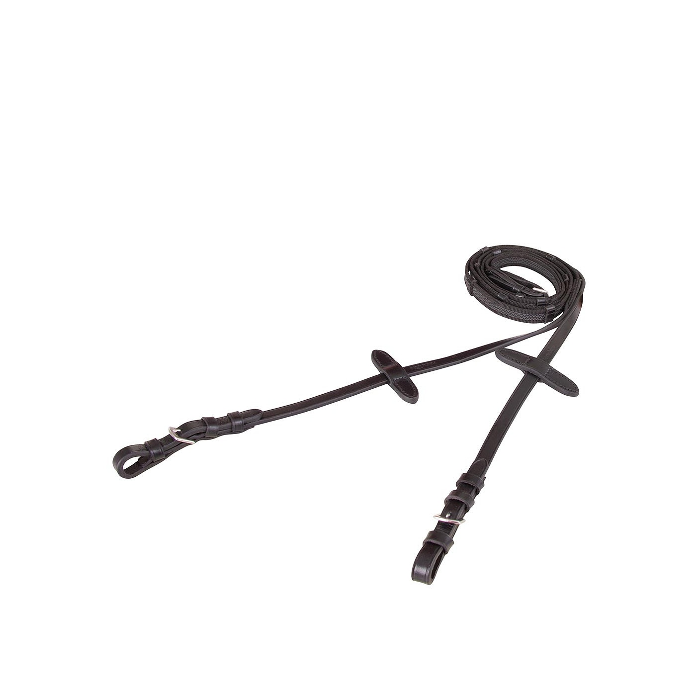 Linnen teugel omwikkeld met rubber voor extra grip. Deze antislip teugel heeft lederen hand- en teugelstops, 16 mm breed. De lederen uiteinden met roestvrijstalen gespsluitingen zijn 13 mm breed.