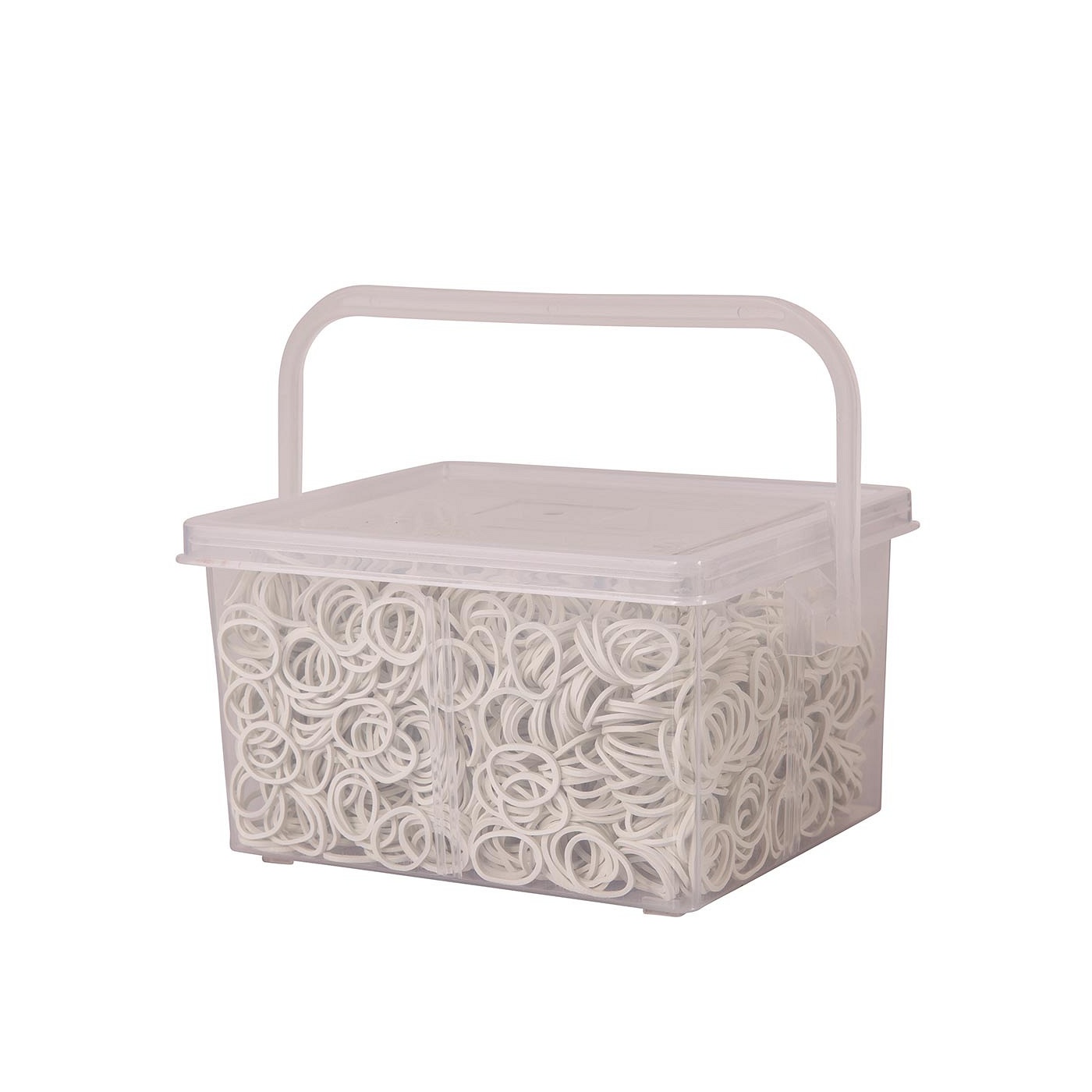 Afsluitbare doos met handvat à 2500 stuks elastiekjes voor het invlechten van de manen. Met op de transparante deksel een handige centimeter indeling, zodat je de manen gelijkmatig kan verdelen. VE 4.
