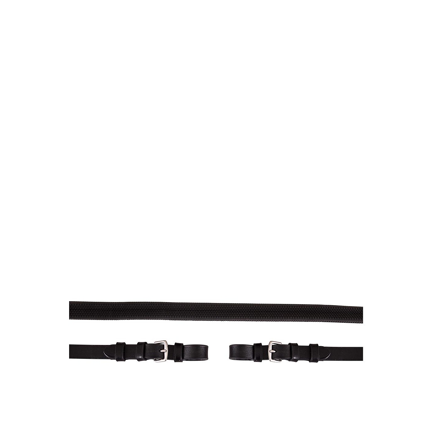 Rubberen grip teugel versterkt met nylon en voorzien van lederen teugelstops, 16 mm breed. De lederen uiteinden met roestvrijstalen gespsluitingen zijn ook 16 mm breed.