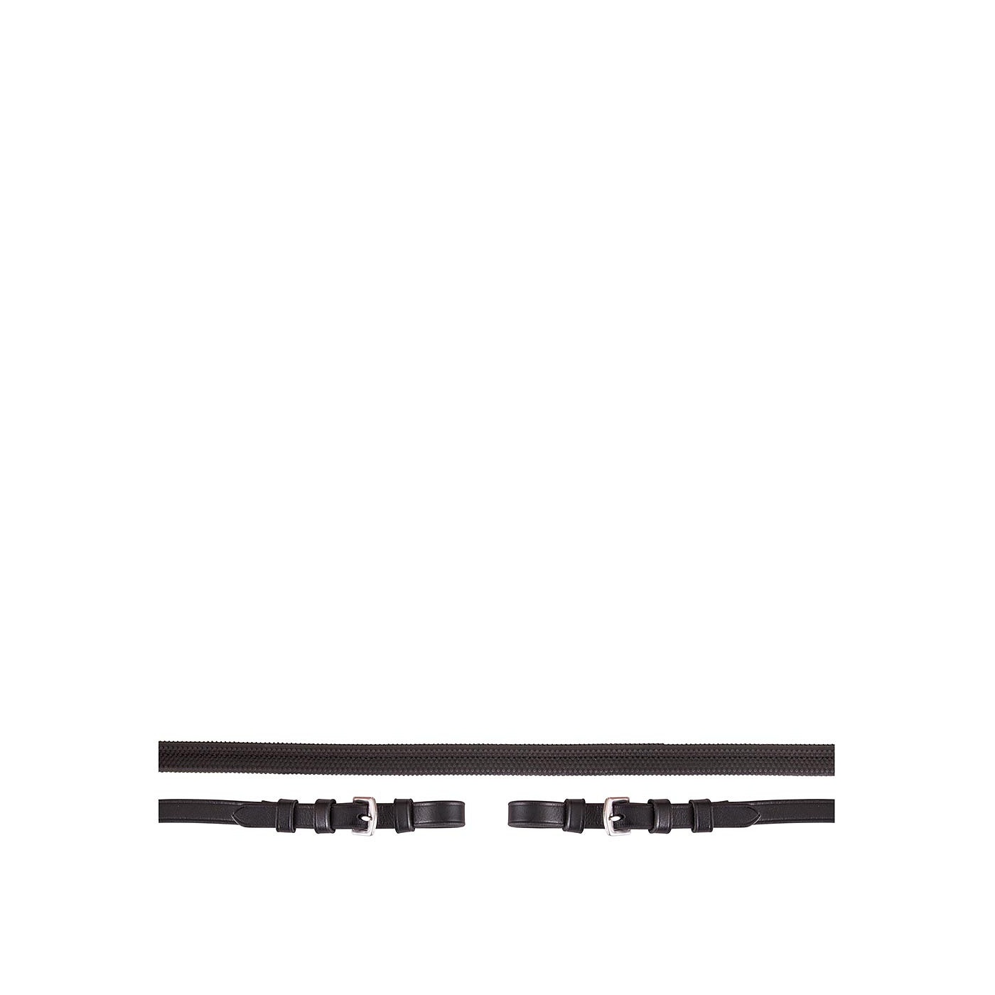 Rubberen gripteugel versterkt met nylon en voorzien van lederen teugelstops, 13 mm breed. De lederen uiteinden met roestvrijstalen gespsluitingen zijn ook 13 mm breed.