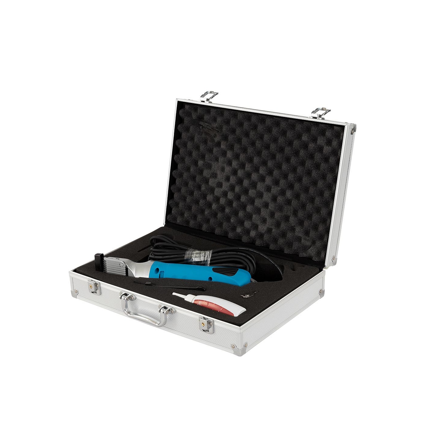 De Premiere Falco wordt geleverd in een luxe aluminium koffer inclusief olie, reinigingsborstel, schroevendraaier, koolborstels en handleiding. Voltage 220-240V~, snelheid 2600 omwentelingen per minuut, geluid ≤73dB, gewicht 1 kg.