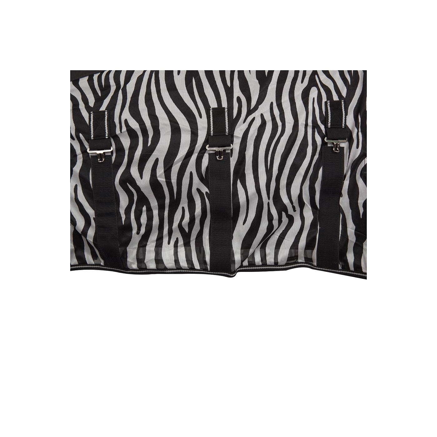 Deze innovatieve zomerdeken biedt het paard optimale bescherming tegen zowel regen, zon als insecten. De multifunctionele, anatomisch gevormde deken met hals is aan de bovenzijde voorzien van stevig 600D ademend polyester met een waterdichte coating, getapete naden en heeft een gladde voering van 190T nylon. Aan de onderzijde bestaat de deken uit 100% polyester mesh in zebramotief. Uit wetenschappelijk onderzoek is gebleken dat een zebramotief minder vliegen aantrekt. De deken is voorzien van een verstelbare dubbele borstsluiting, loopsplitten, elastische bilkoorden en een staartflap. Het vaste halsdeel is voorzien van een dubbele klittenbandsluiting en is uitgevoerd met een geïntegreerd stretchpaneel (waterdicht) ter hoogte van de schoft, dat zorgt voor extra bewegingsvrijheid en comfort voor het paard. Het halsdeel is met behulp van drie elastische klittenbandsluitingen te bevestigen aan het halster. De buik wordt volledig beschermd door de brede buikflap met drie verstelbare singels en klittenband. De deken is uitgerust met fournituren van zink met een matte, zilverkleurige finish. Machine wasbaar op 30°C.