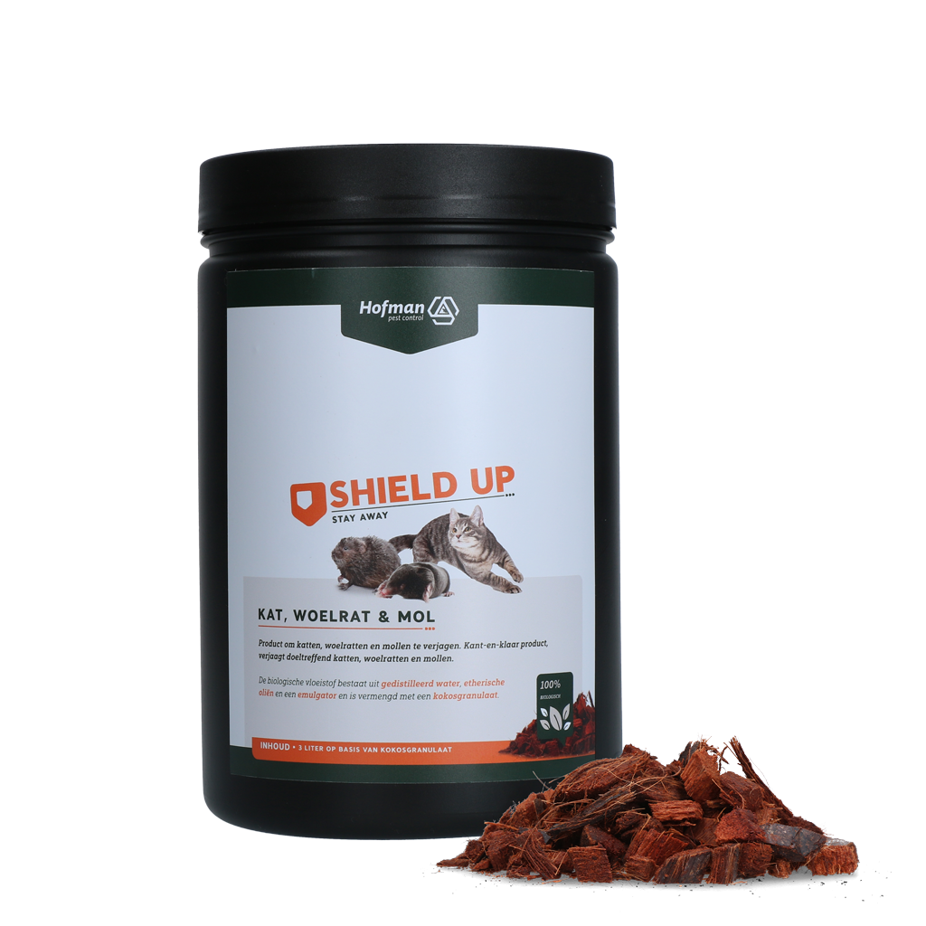 Shield Up Stay Away Kat/Woelrat/Mol is een kant en klaar product en verjaagt doeltreffend katten, woelratten en mollen.