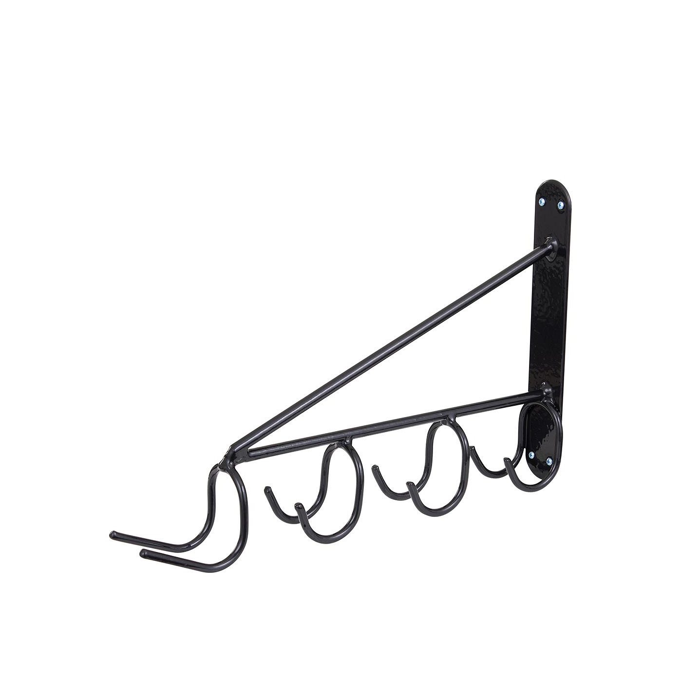 Ruimtebesparende gereedschaphouder voor vier stuks gereedschap. De drie achterste haken zijn geschikt voor schoppen, harken, bezems en dergelijke, terwijl op de grotere voorste haak ook een bezem op zijn kop kan hangen. 31 x 7 x 47 cm (h x b x d).
